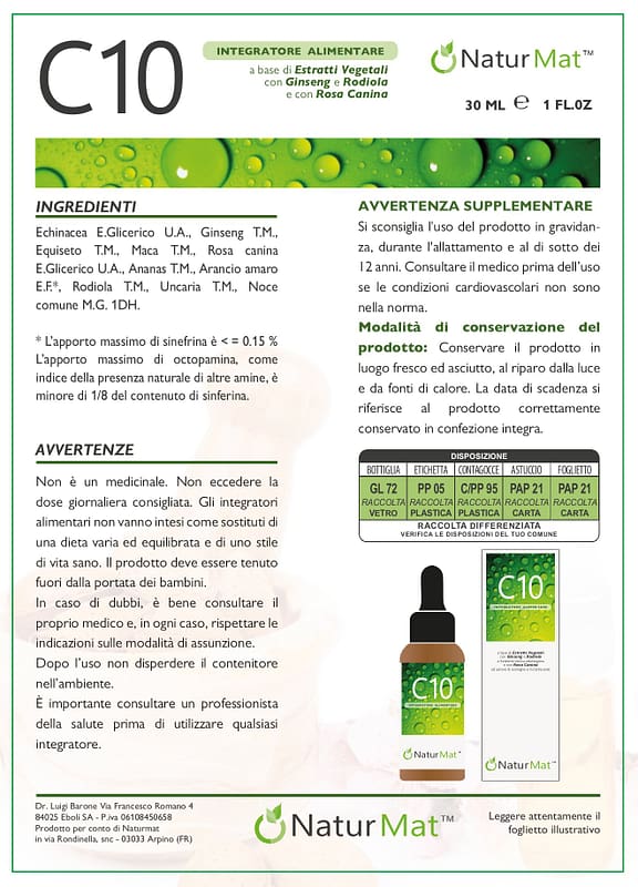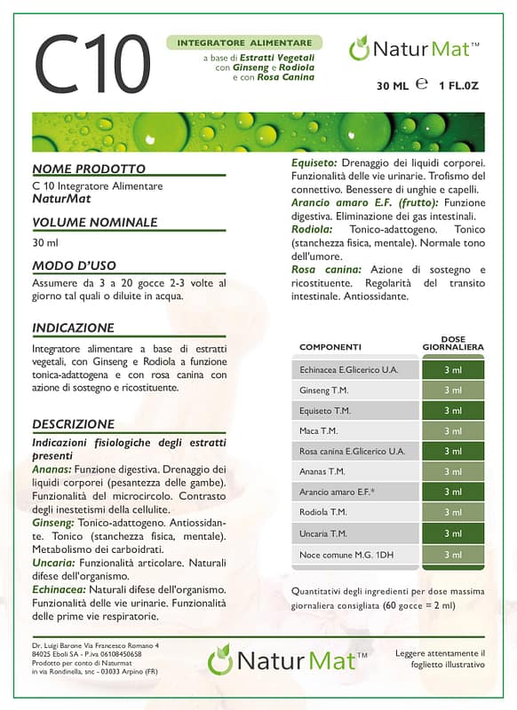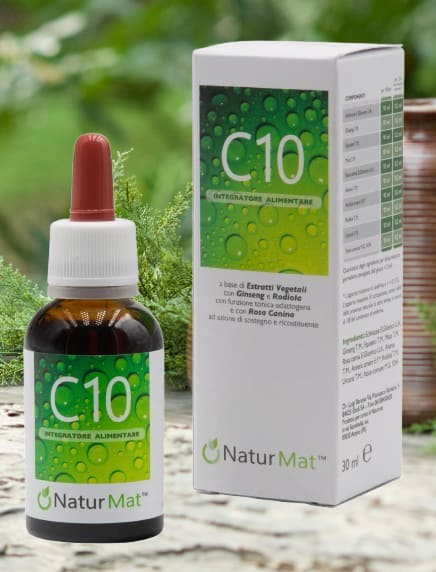 C10 NaturMat è un integratore alimentare in gocce a base di 10 estratti vegetali selezionati. La sua formulazione naturale favorisce il benessere quotidiano e contribuisce a sostenere energia e vitalità. Il complesso di ingredienti agisce in sinergia per accompagnare i momenti di stanchezza, cambi di stagione o situazioni di stress, offrendo un supporto naturale all’equilibrio del corpo e della mente.Rodiola: sostiene il tono dell’umore e la resilienza. Rosa canina: ricca di vitamina C, con azione antiossidante e ricostituente. Echinacea e uncaria: piante tradizionalmente utilizzate per favorire le naturali difese. Equiseto e lime: contribuiscono alla funzione depurativa e alla sensazione di leggerezza. Ginseng e noce comune: completano la formula con un sostegno naturale alla vitalità e alla lucidità. Ogni goccia di C10 NaturMat racchiude l’equilibrio tra tradizione botanica e formulazione moderna, pensata per chi cerca un benessere naturale. Il prodotto è privo di glutine e adatto a chi segue una dieta vegetariana. Leggere il bugiardino posto nella confezione. Perché scegliere C10 NaturMat Un unico integratore in gocce, concentrato, pratico e completo: C10 NaturMat agisce in modo sinergico su energia, umore, digestione e benessere mentale. È adatto a chi cerca un supporto vegetale quotidiano, privo di ingredienti sintetici, altamente assimilabile e con una formulazione bilanciata per tutte le età adulte. Prodotto registrato:Integratore incluso nel Registro del Ministero della Salute, codici 156738 e 176456. Dove acquistarlo: Puoi acquistare C10 NaturMat sul nostro sito ufficiale con spedizione rapida in 24/48h. Avvertenze: Non superare la dose giornaliera consigliata. Tenere fuori dalla portata dei bambini al di sotto dei tre anni di età. Gli integratori alimentari non sostituiscono una dieta varia, equilibrata e uno stile di vita sano. Conservare in luogo fresco, asciutto, al riparo da fonti di luce e calore.
