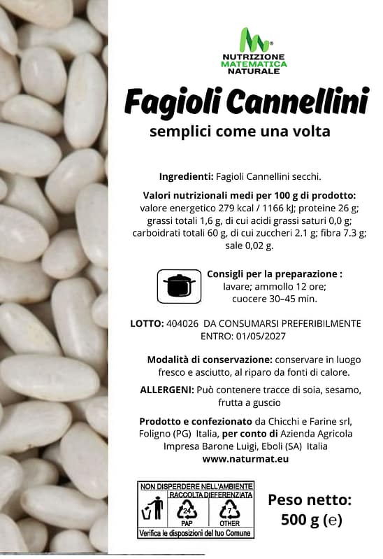 Ingredienti: fagioli cannellini secchi. Peso netto: 500 g (℮)