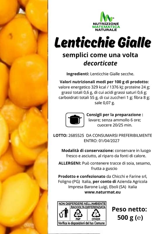 Ingredienti: Lenticchie Gialle secche. Peso netto: 500 g (℮)