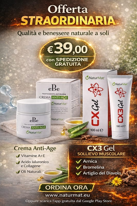Crema ebe NaturMat antiage per viso e corpo unisex con Vitamina A ed E, acido ialuronico, collagene ed elastina, aiuta a migliorare elasticità e tonicità della pelle, riducendo i segni del tempo. Ingredienti naturali come burro di karité, olio di argan, oliva e jojoba, insieme ad aloe vera e provitamina B5, nutrono, idratano e donano luminosità. Il Gel naturale CX3 NaturMat, a base di Arnica, Artiglio del Diavolo, Bromelina e mentolo, è l’ideale per dare sollievo a muscoli affaticati e articolazioni, con effetto rinfrescante e rapido assorbimento. Due prodotti in un’unica offerta speciale. Ordina ora su naturmat.eu oppure scarica l’app gratuita dal Google Play Store Grazie per essere con noi, e alla prossima offerta con i prodotti Naturali.